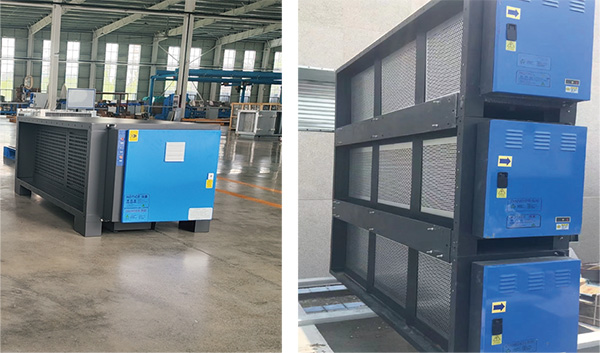 民用油煙與工業油霧凈化機組采用機械分離和靜電凈化雙重作用,含油煙廢氣在風機的作用下吸入管道,首先通過前置過濾器、大顆粒物被濾除,分離出的大顆粒油滴在自身重力的作用下流入油槽排出。剩余的微小粒徑油霧粒子進入電離區,電離區采用二段式高低壓分離的靜電工作原理,第一級電離極板的電場使微小粒徑油霧粒子荷電,成為帶電微粒,這些帶電微粒到達集塵區后立刻被吸附且部分炭化。同時高壓靜電激發的臭氧有效地降解有害成分,起到消毒、除味的作用,最終排出潔凈的空氣。